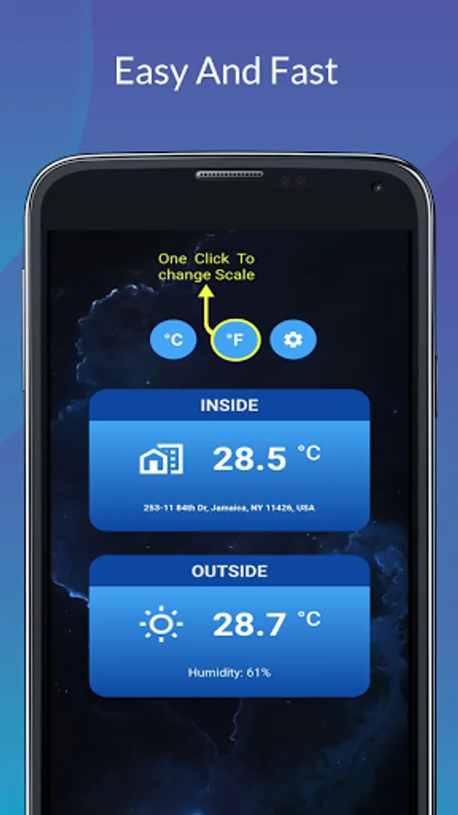 Indoor Thermometer for Room Temperature helps you to get estimate room temperature of room or your environment. Simple thermometer measures ambient temperature inside and outside. Room Temperature Thermometer app can displays the current room temperature and weather room temperature based on your current location. Today Temperature App measures current temperature with accurate digital thermometer tool. Features: - Current temperature, Humidity Calculator, Air Pressure, Smart thermometer, Feels Like, Sunrise and Sunset app, check temperature meter.