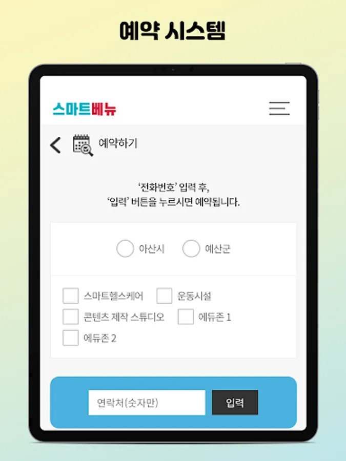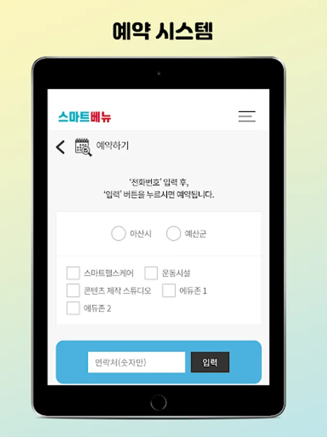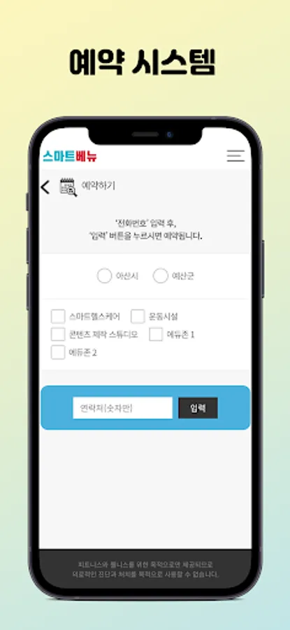 You can use the Smart Venue reservation service not only inside the Smart Venue but also outside through the APP. It is a platform where you can make a reservation using your mobile number for each smart venue area (currently Yesan-gun and Asan-si, Chungcheongnam-do) and facilities you want to use.