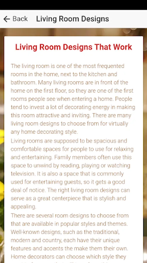 From this app, you will get to learn living room design through the articles provided. You will get to know many things by going through all the articles. You will get some ideas on this topic, its types, home interior, bedroom decorating ideas, living room decor, small bedroom ideas, beautiful living rooms, front room ideas and many more. Many more articles will be added gradually to the 'Articles' section of the app to help you in learning more.