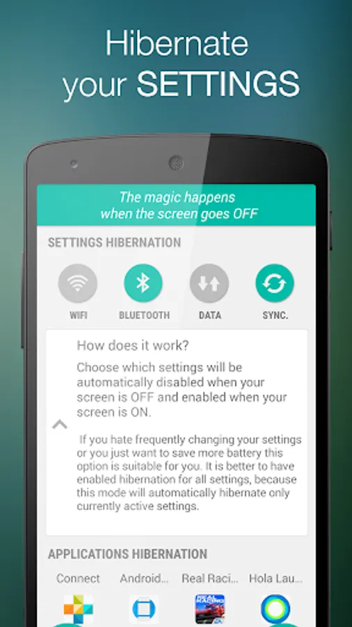 Choose which settings will be automatically disabled (hibernated) when your screen is OFF and enabled when your screen is ON.