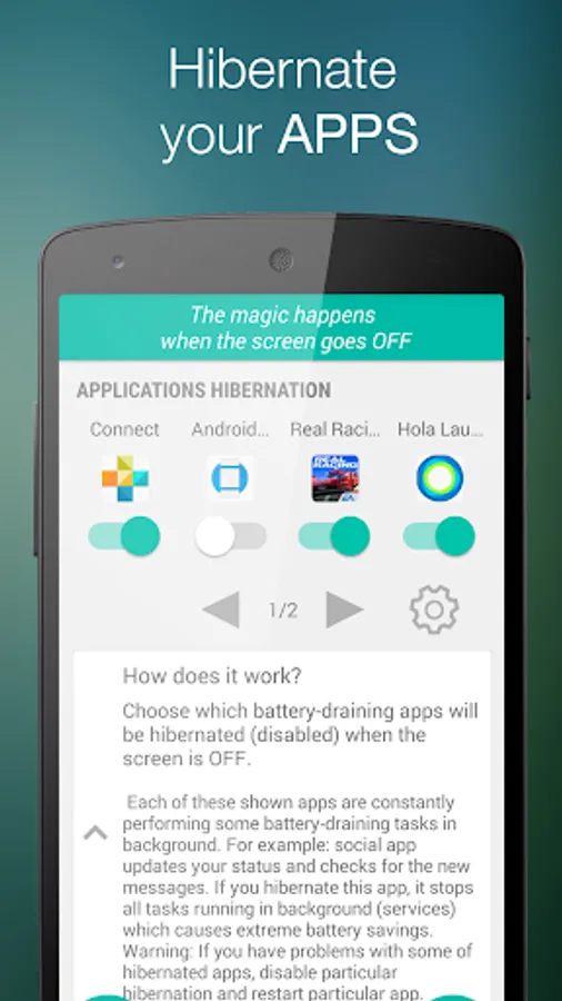 Choose which battery-draining apps will be disabled (hibernated) when the screen is OFF.
