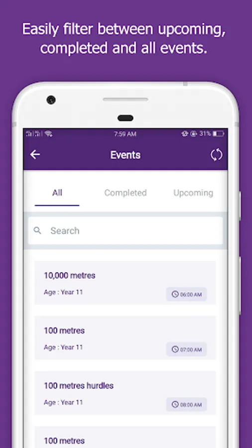 • Filter between upcoming & completed events within your meets making the result entry easy