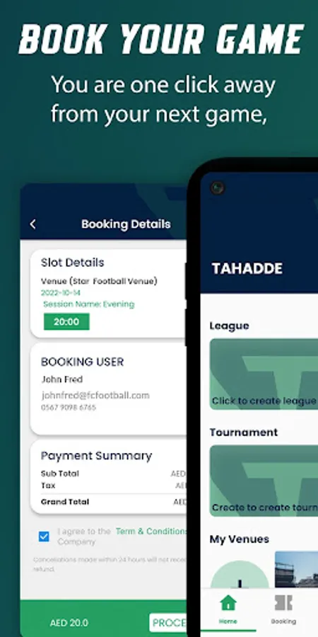 Tahadde app is a booking platform for all football pitches in the UAE. We have put together the perfect package to help you take your passion, sport and energy and transition all of that into real world actions. The app helps users to find available pitches, get directions to the pitch and book your game, anytime anywhere. You will be able to create leagues, plan events, invite players, book pitches and most importantly play the beautiful game.