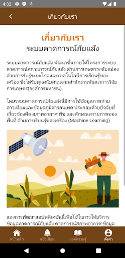 It is a field management application that helps farmers to manage their fields and adjust them in a timely manner. It provides information on agricultural drought forecasts. weather forecast soil moisture level and advice on suitability for cultivation It was analyzed using satellite imagery and geospatial data, including weather conditions, vegetation and the physical characteristics of the area. with machine learning techniques and information supported by government agencies such as water data and drought declarations, etc.