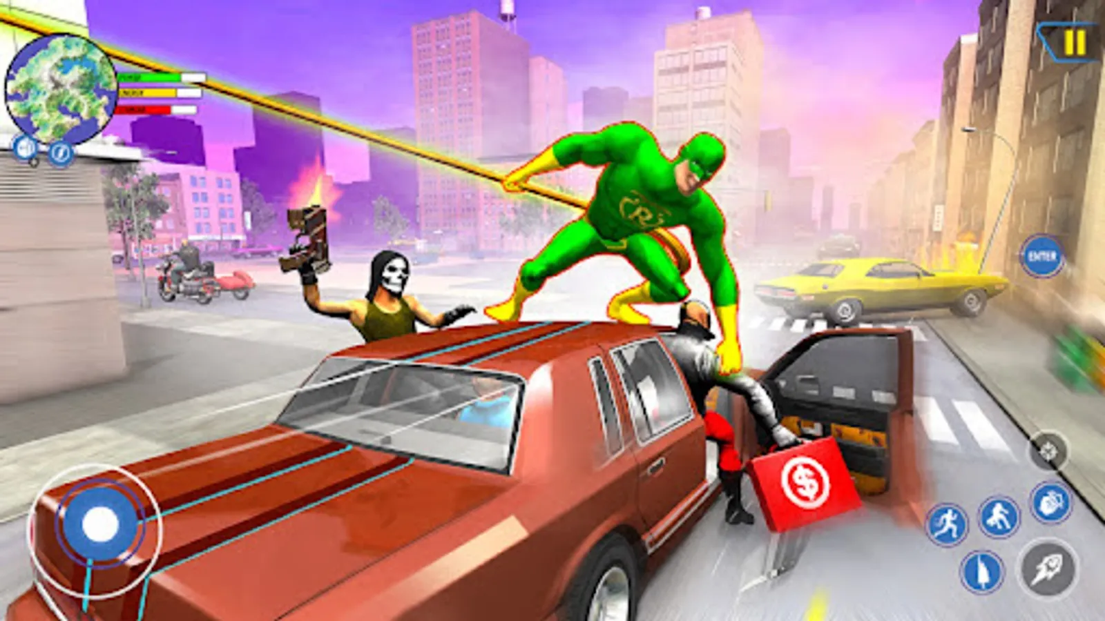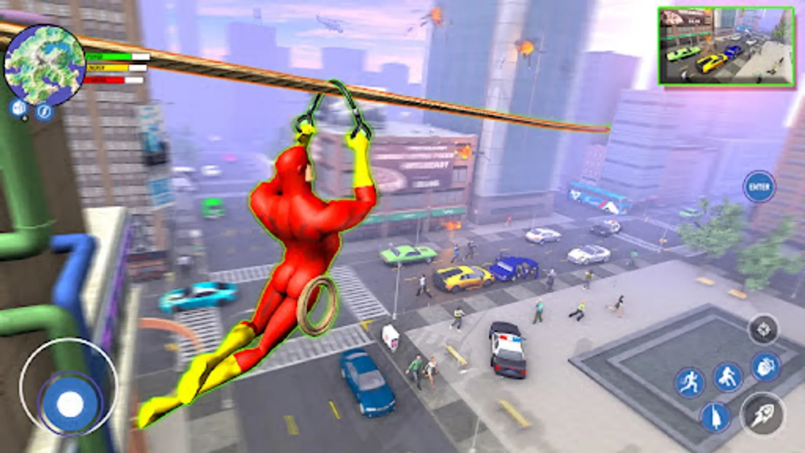 You have a superheros with superpowers. With a super rope at his arsenal, he can move around buildings and land on top of them while performing mega jumps. Rope jumps enable the hero to keep an eye on what's going on in the city streets at all times.