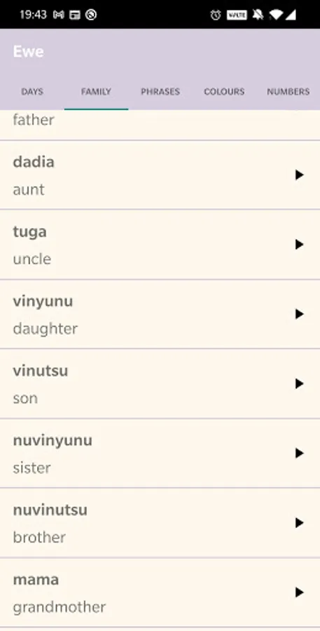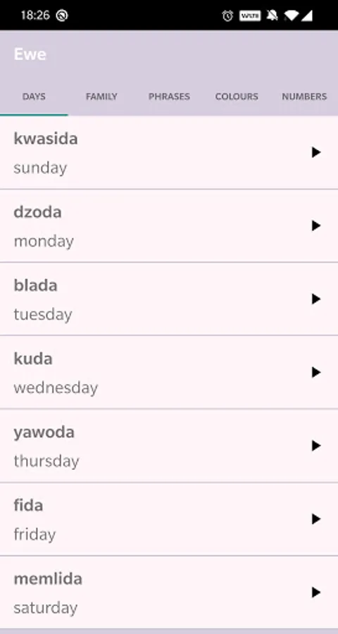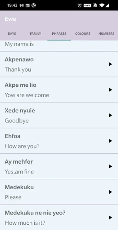 The Ewe Language App is an introductory app for people interested in learning basic words and sentences in the Ewe language. This app contains Ewe translations for colors, numbers, family members, days of the week and simple conversational sentences. Both words and sentences are accompanied by a short audio of the Ewe pronunciation. Learning Ewe made simple for beginners.