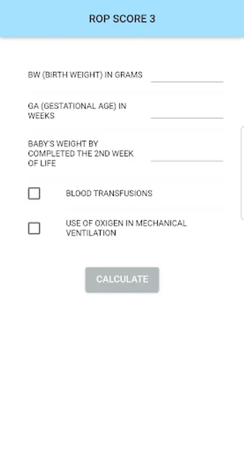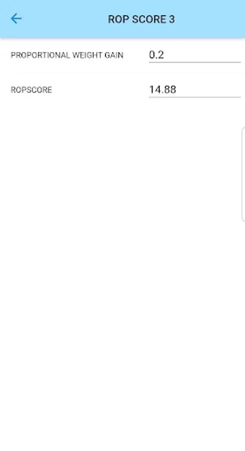 ROPScore predicts severe ROP assuming a specific cut off level that needs to be validated for each population. The score is calculated once per child at 2 or 6 weeks of life. The aim is to decrease the number of screened children and/or reduce the frequency of examinations in low risk infants. This process requires the following parameters: BW, GA, weight gain proportional to BW measured at the given week, the presence or absence of blood transfusion and oxygen in mechanical ventilation up to the analyzed week.