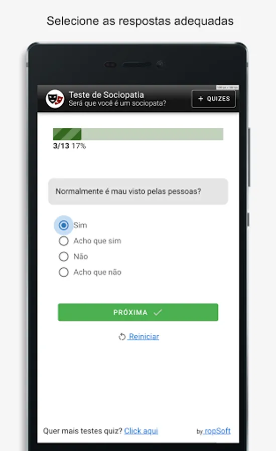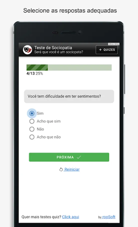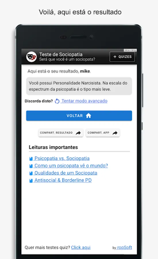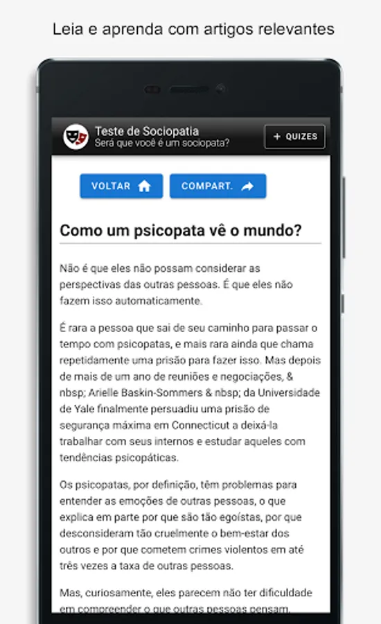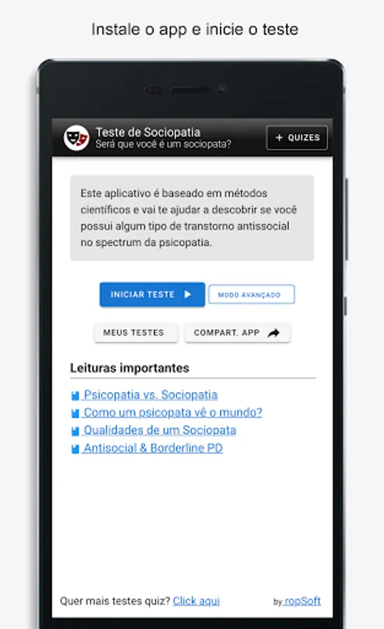 This app is a quiz based on scientific studies. It will identify if you have antisocial personality disorder such as psychopathy, sociopathy, traits of narcissism or similar symptoms.