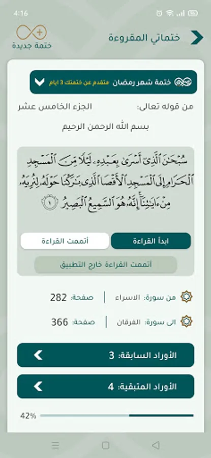 An application that specifies a daily response for readers to contribute to spreading the culture of reading the Noble Qur’an and persevering in it .. The user of the application determines the daily roses that he wants to continue with and determines where to read roses "inside the application - outside" or listen to the roses or participate in groups to read the Qur’an separately or Subscribe with one stamp