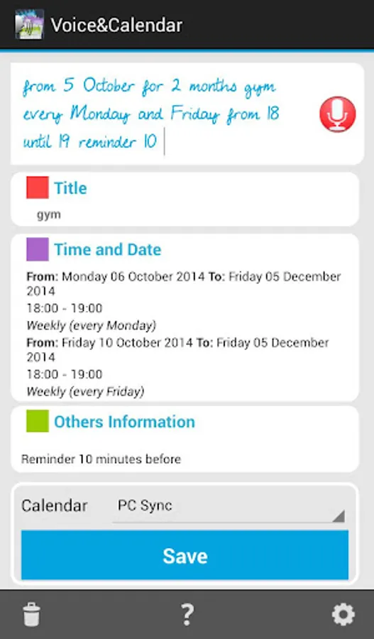 No more tedious filling of fields for event details, with Voice&Calendar add new events in the calendar is simple and fast.