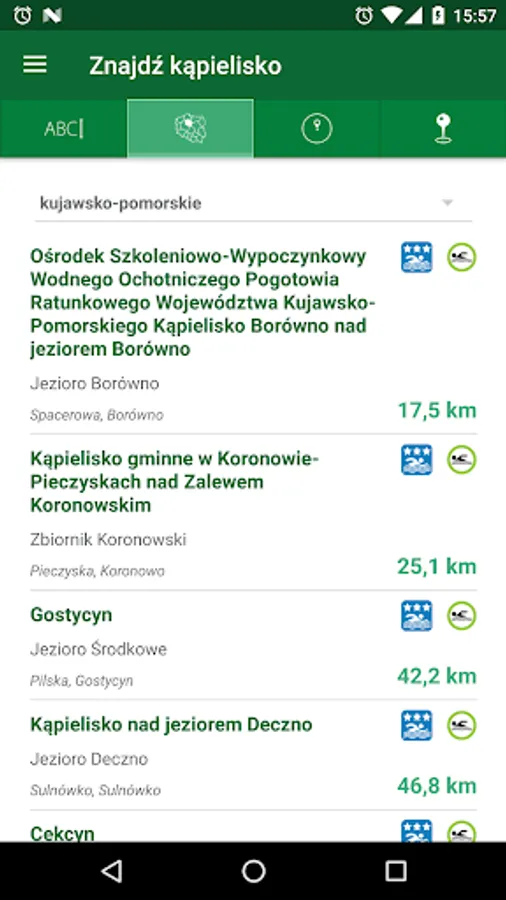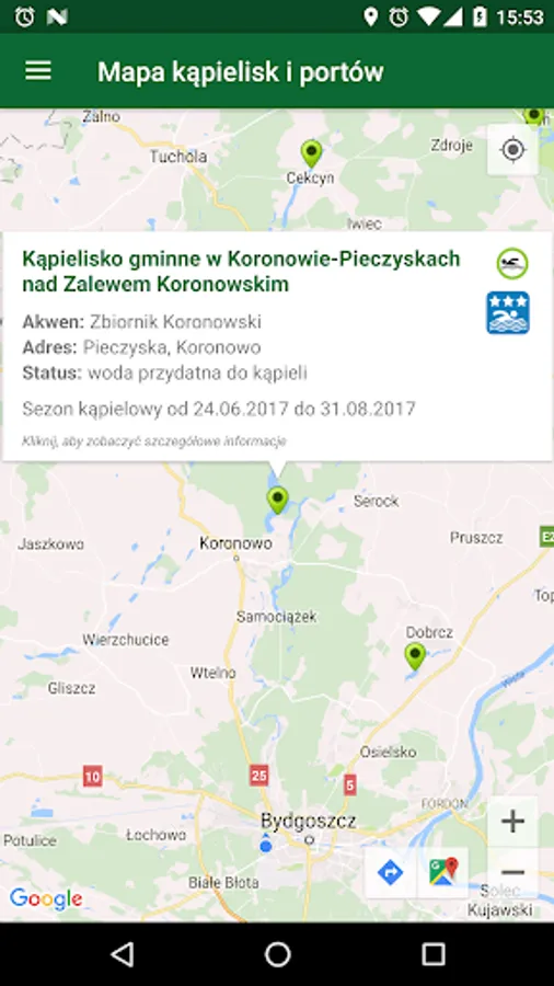 The application notifies users of any available, safe bathing in our country controlled by the GIS. The primary function is to find bathing on the map, with the ability to display information about it - a brief description, infrastructure, and photo gallery. The application also allows you to show the route directions from where we are currently in. Additionally, after you select the region appears to us a list of all monitored bathing on its premises. Safe swimming pool that is, which is monitored by the Chief Sanitary Inspector and in accordance with the regulations - with support rescuer. Additionally, the application to keep collecting data on water quality in different locations and includes a search engine bathing using parameters such as the radius in which we find a swimming pool, name, town or radius from the selected village.