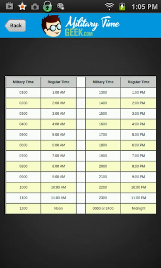 Press the "i" button on the bottom right corner to see a Military Time Chart