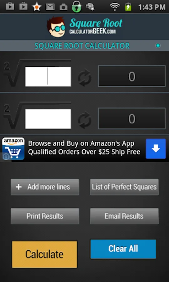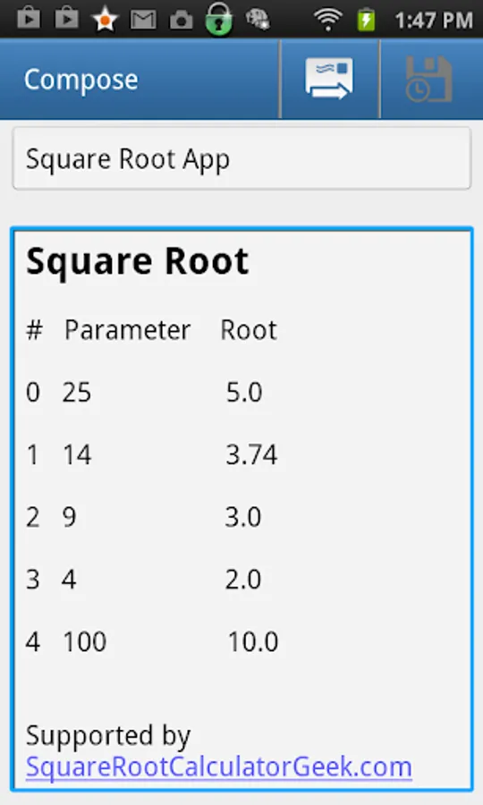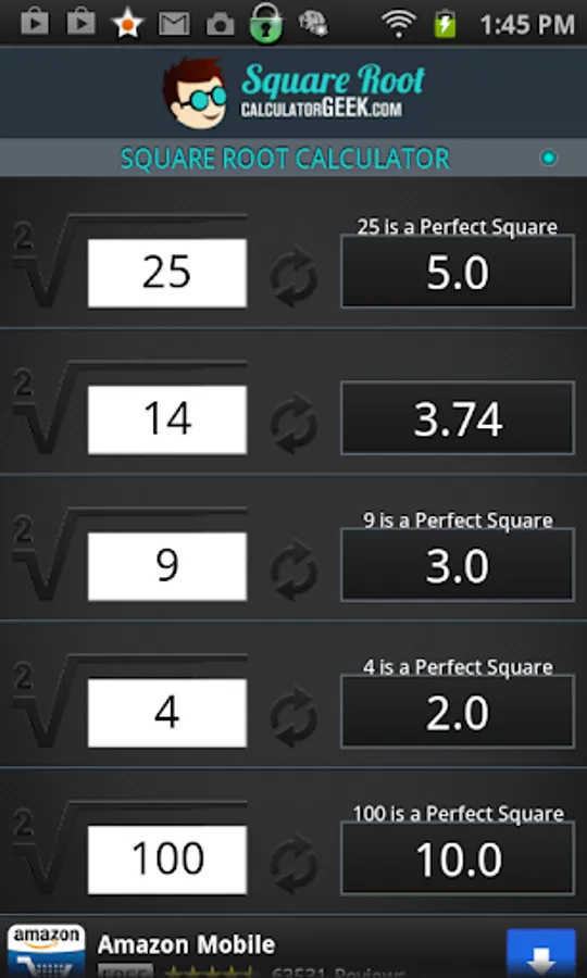 PERFECT SQUARES are the squares of whole numbers. This APP will advise you as it calculates if a square root is “perfect”