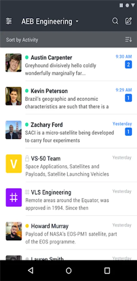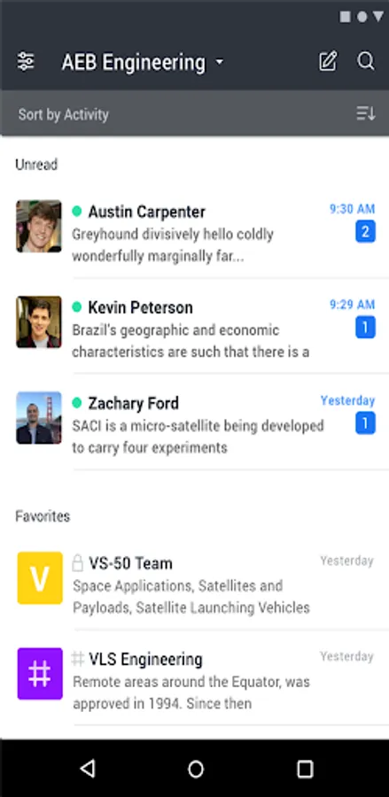 * Sort chat rooms and groups alphabetically or group by activity, unread messages