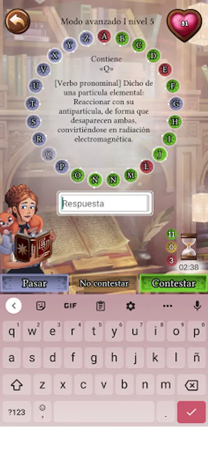 Spanish (Castilian) vocabulary game in which you have to find the correct word for each definition. You have limited time to answer 25 definitions, accumulate points and enter the online rankings.