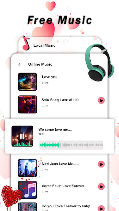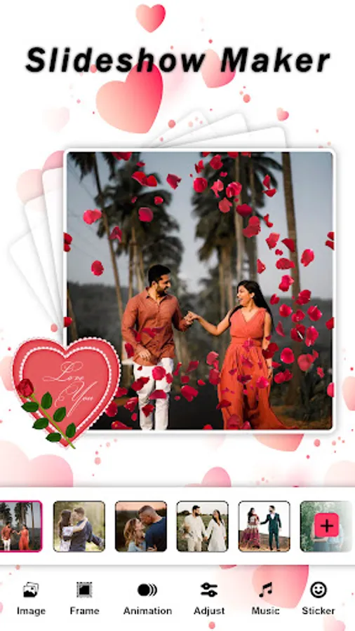 love video maker with music video is the easiest way to create, edit, and share videos, compelling love songs, slideshows and love stories with your photos and crown flower stickers.