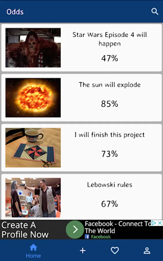 Odds allows everyone to help figure out the subjective probability of anything. Will cassettes make a comeback? Will your friend ever find a job? Will anyone download this app? What do you think?