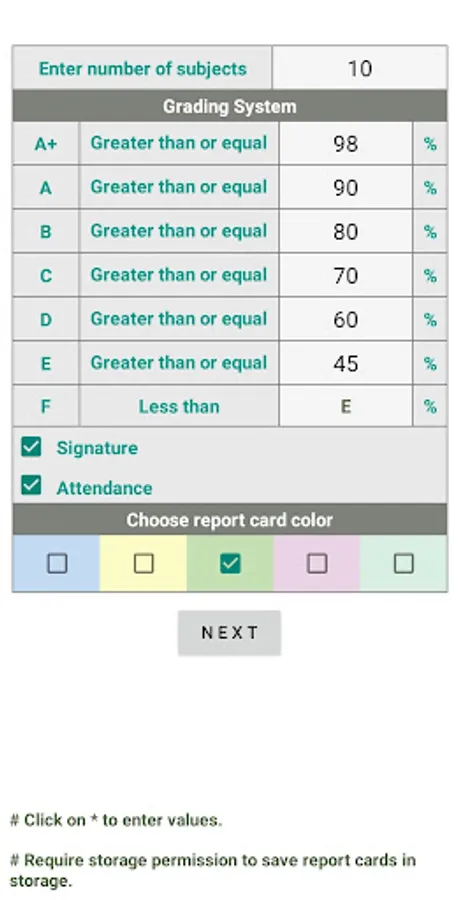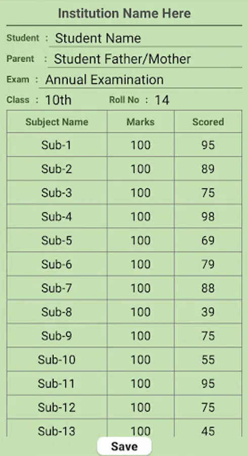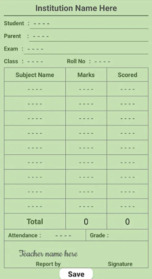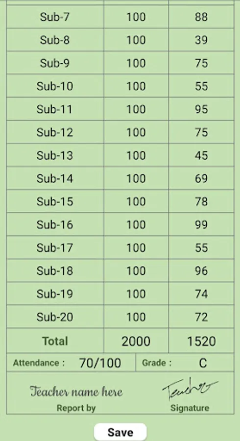 Using this app you can create exam report card of minimum 5 to maximum 20 subjects. It will calculate values automatically and provide Total & Grade. To enter values, Just click on " * " and fill. You can access saved report cards from Gallery and also from My Files.