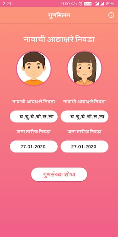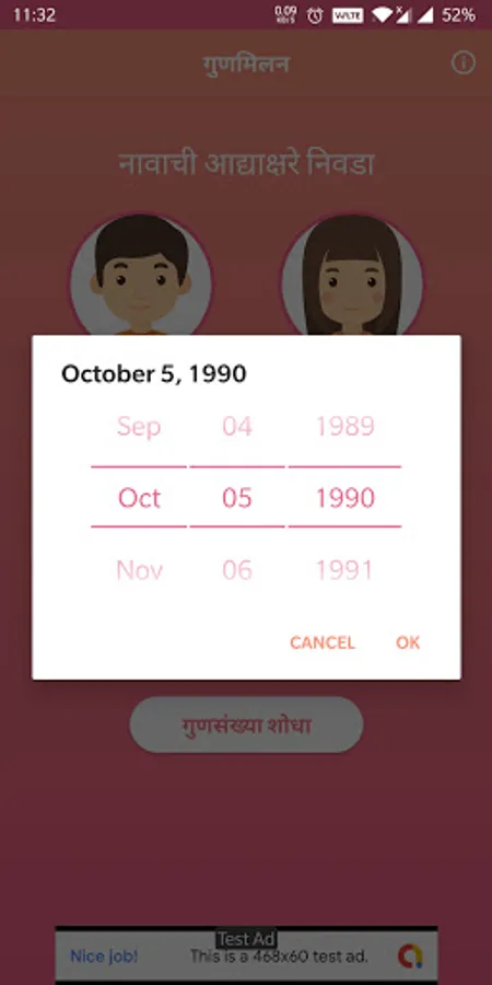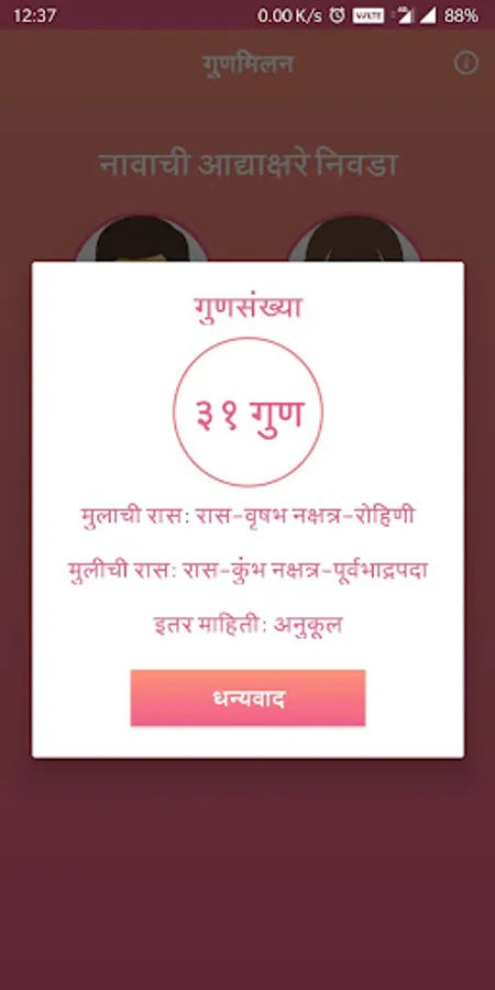 The app shows the matrimonial compatibility between two individuals based on there birth initials and birth date.