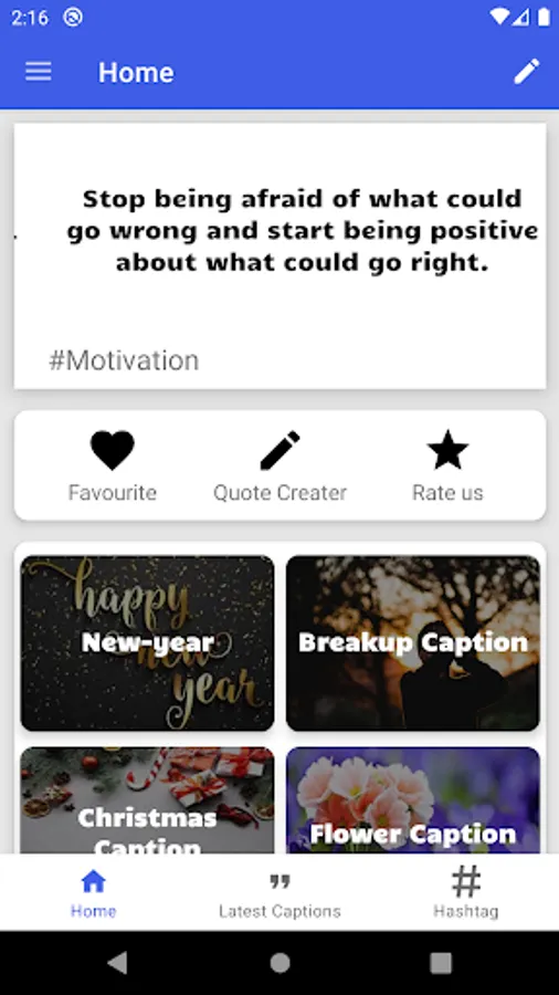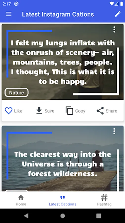 Every time we want to post some photos or selfies on social media we want to use some captions with photos but we cannot think of these Photos captions instantly. So this application brings you easy, Now you can use more than 5000+ quotes in different 30 categories.