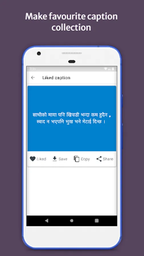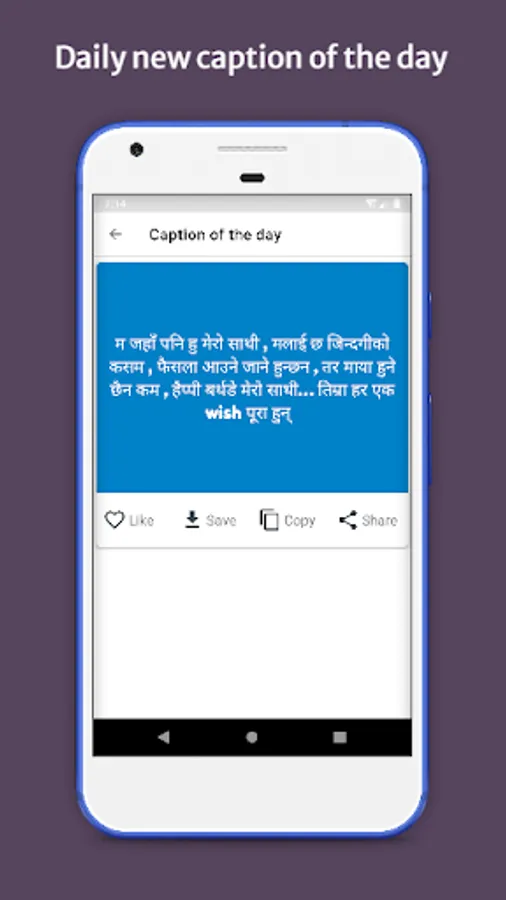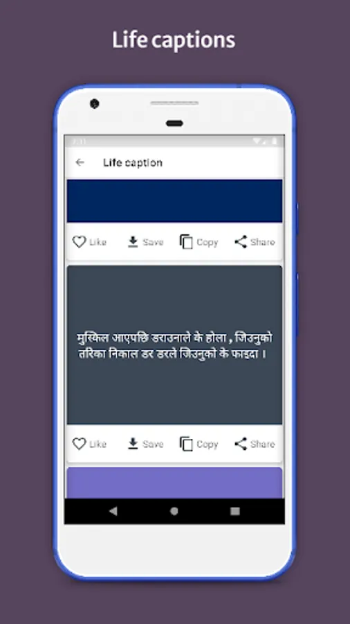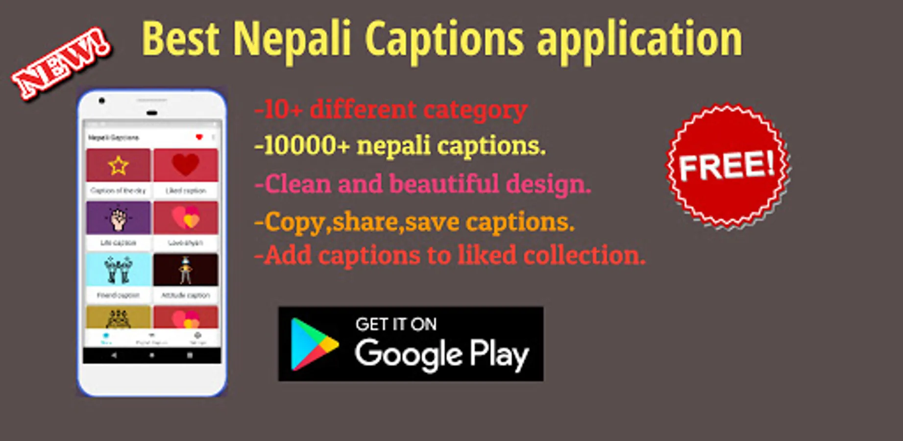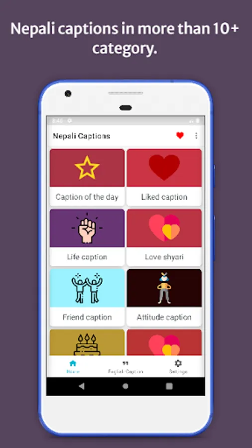 With this application, you can enjoy 1000+ Nepali captions in different categories. Use these captions anywhere in your life as Facebook status in Nepali, WhatsApp status in Nepali, insta quotes, Twitter status,, etc and gain more likes and fame in social media.