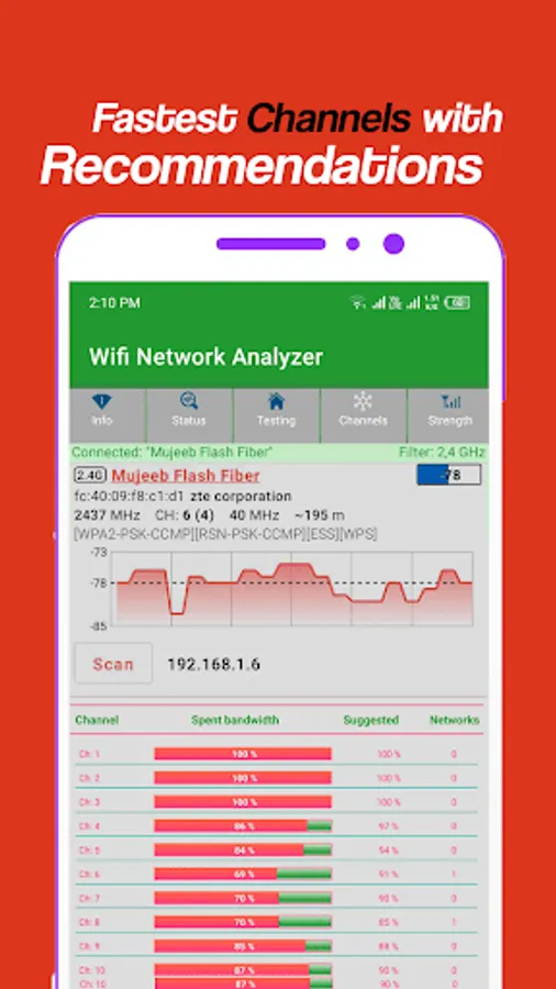 Channels: - Analyzer channels spent bandwidth, speed and strength with the help of graphical UI e.g. Chart and recommendation for channel usage.