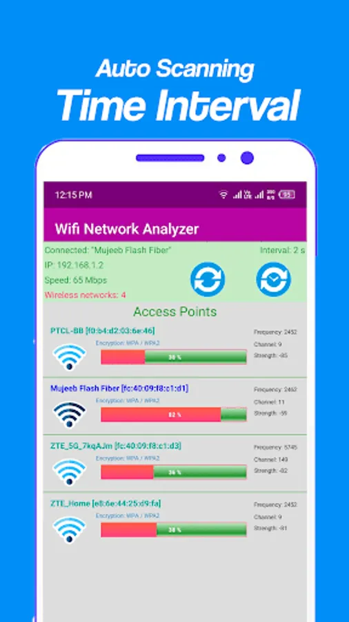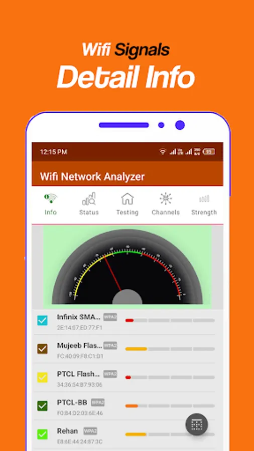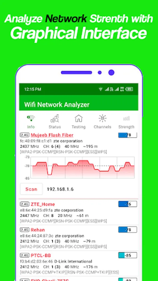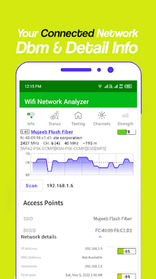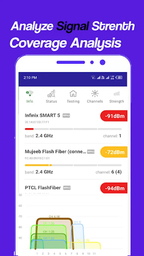 Strength: - In strength tab screen check out the strength and frequency of all nearest access network points which is in your surrounding area with the help of chart to compare power levels of nearest WiFi networks signal strength.
