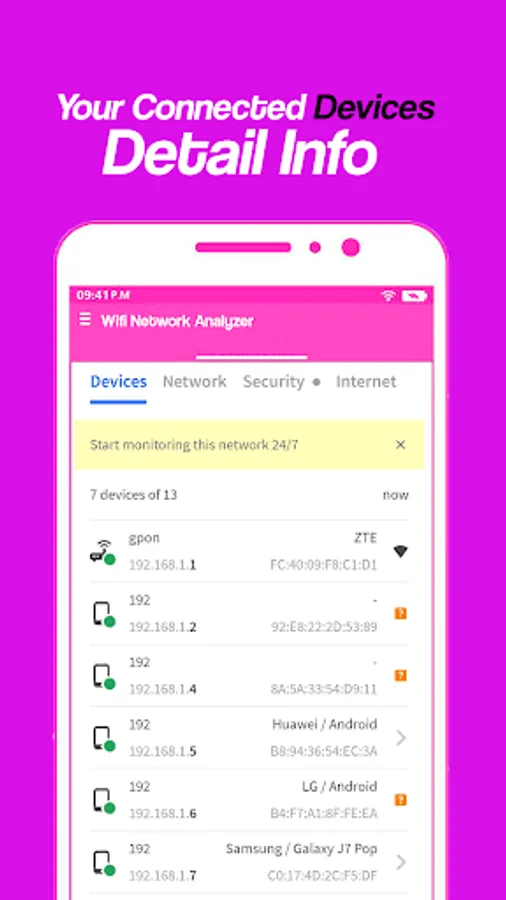 Power full analyser tool to collect data about nearest wifi networks parameters e.g. Main network info dbm, signals strength, channels and test signals and frequency with connections.
