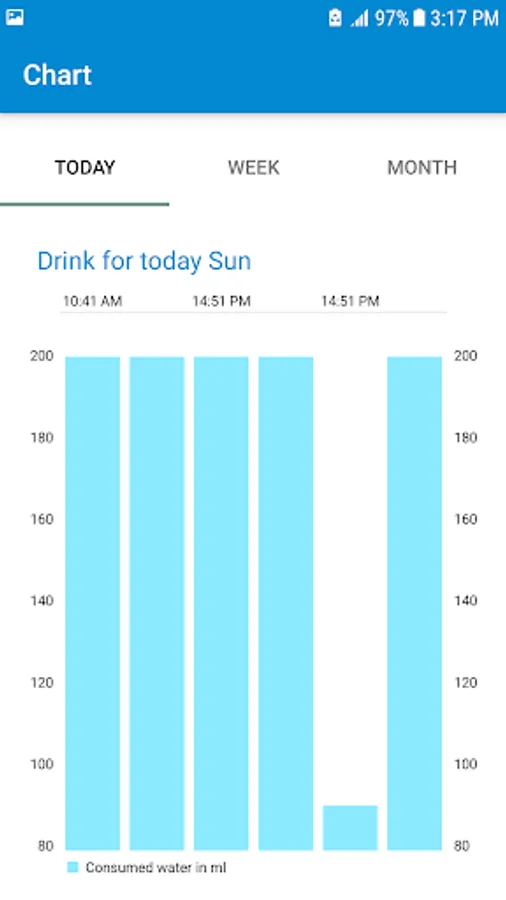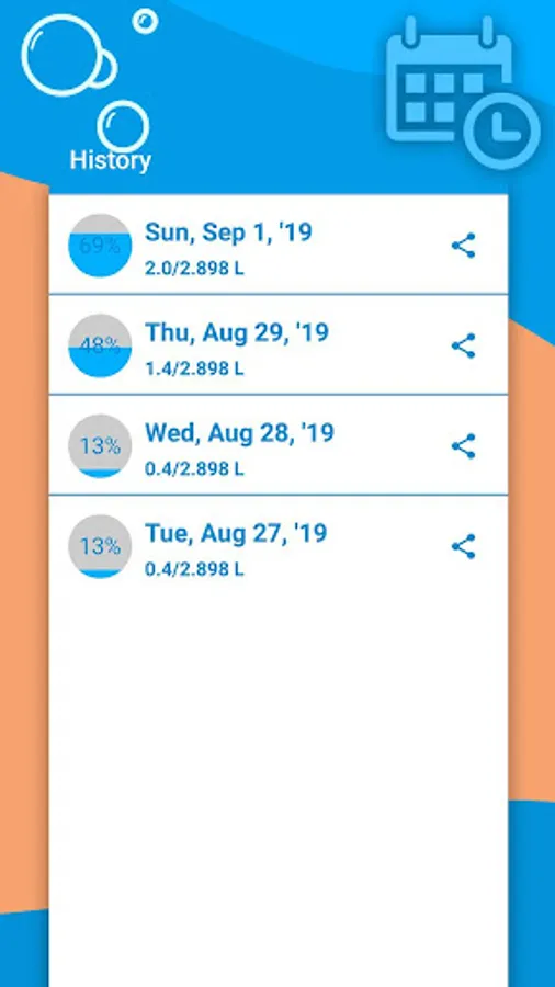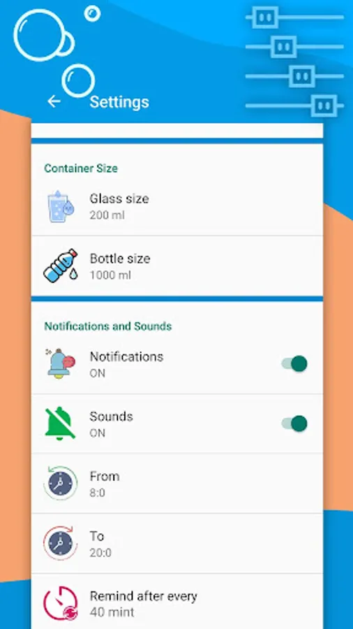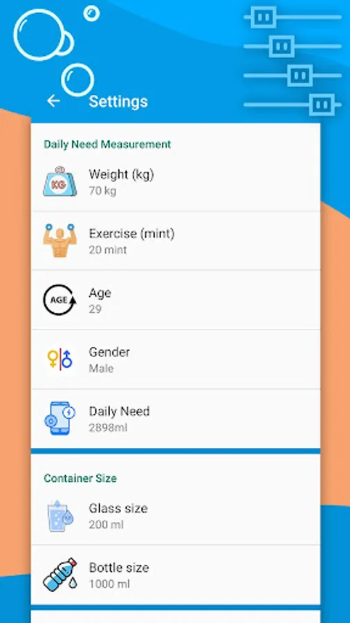 By mentioning Glass size, bottle size or by adding custom size will improve the water intake calculation also it will be adding into your personal history user can check out the history on daily bases it will store history parameters e.g. time, glass or bottle size and date.