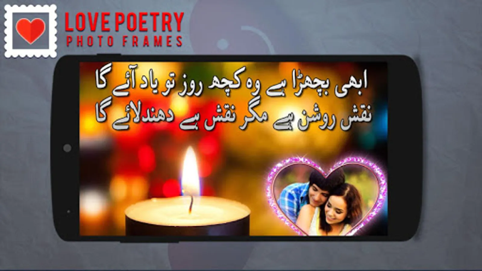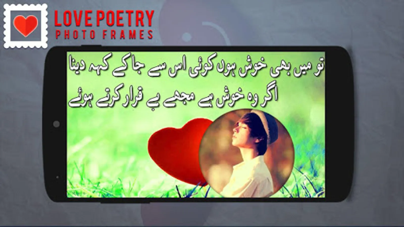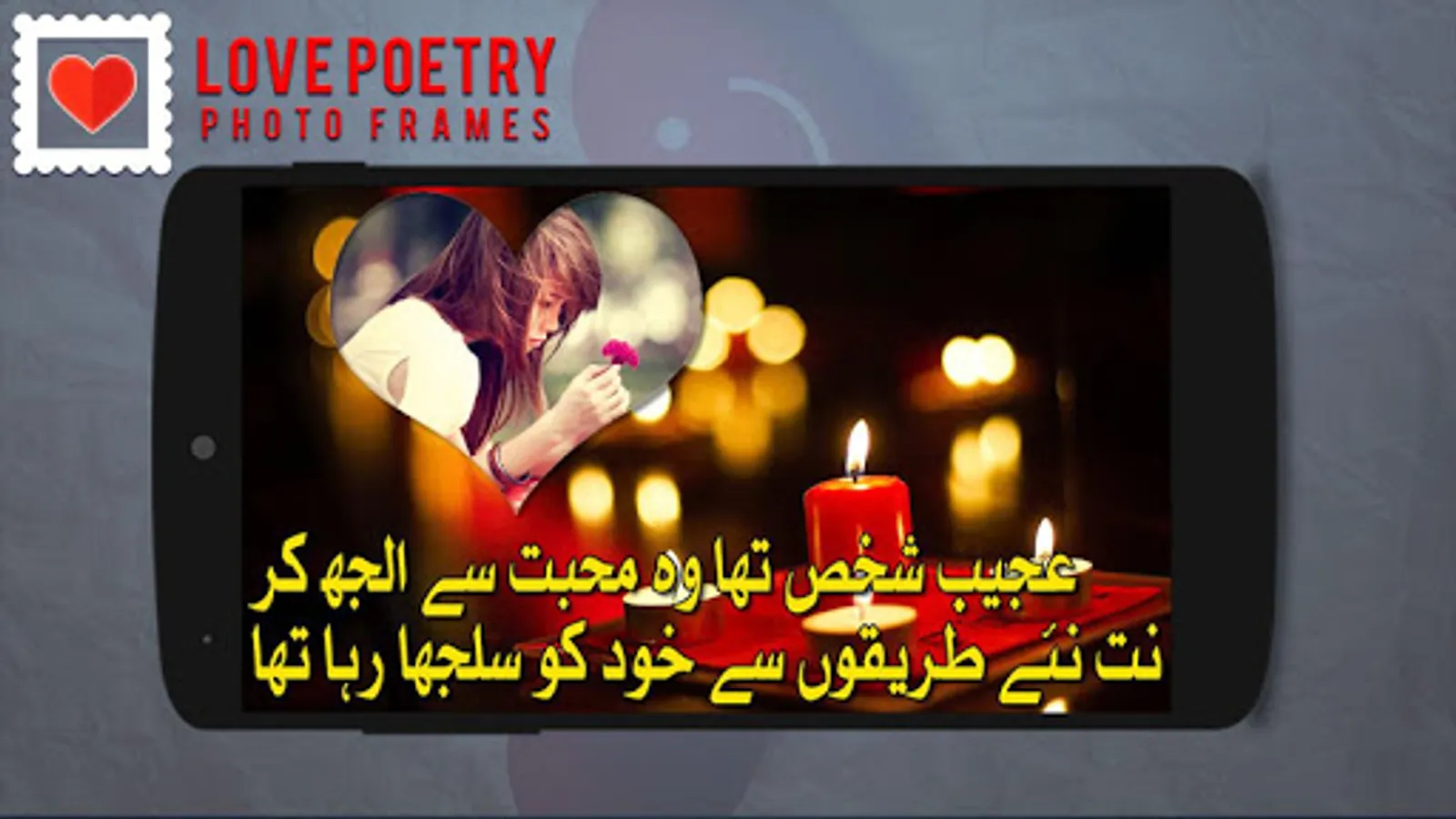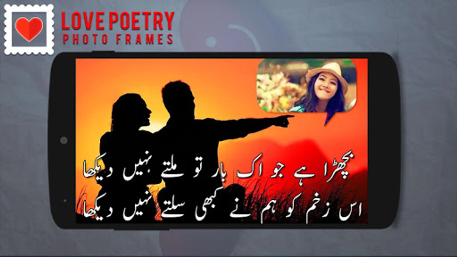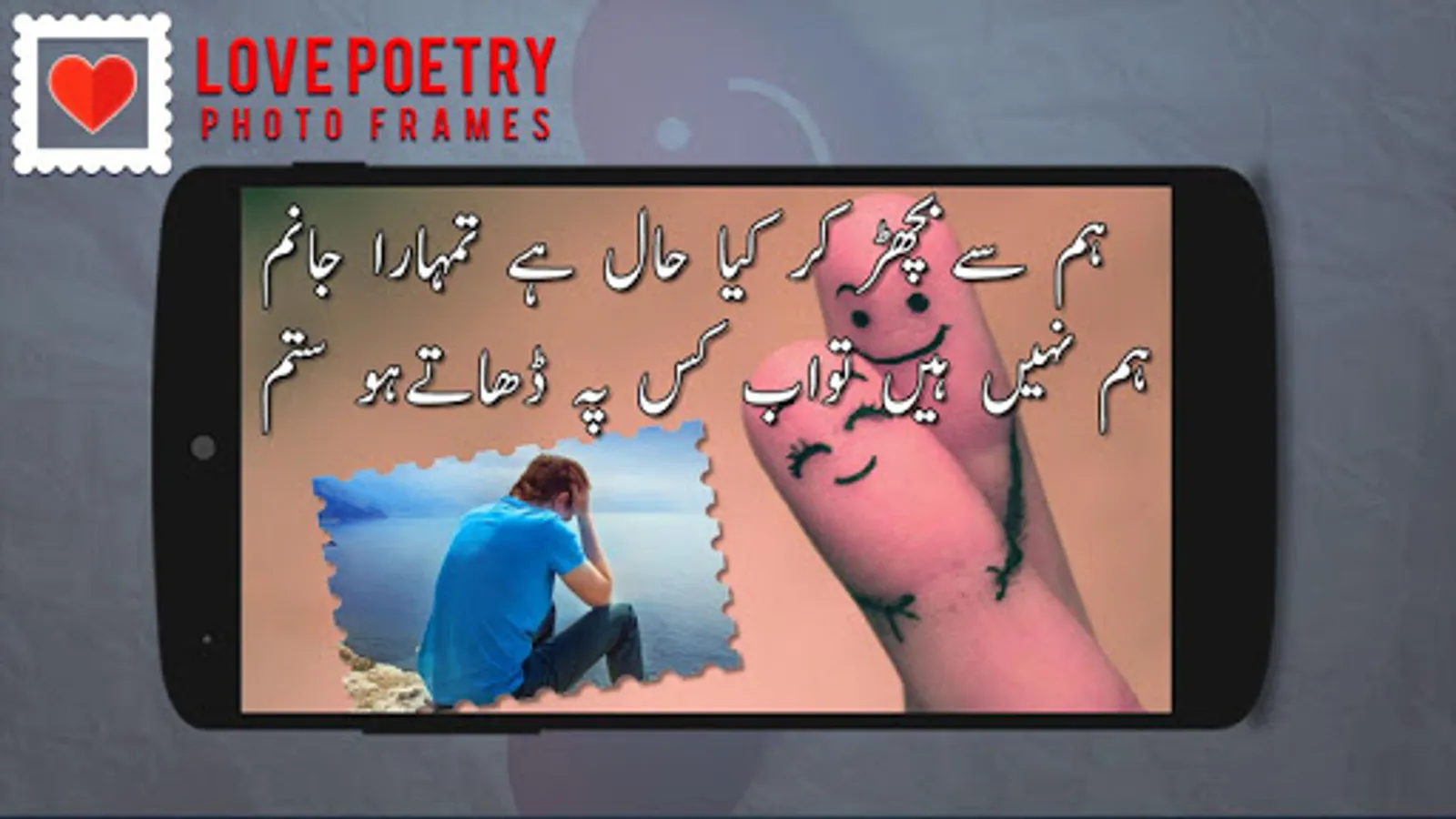 Decorate, beautify and design your pictures with sad love urdu poetry photo frames poetry may be of 2 lines, four lines or compose with complete ghazal e.g. multiline, you can also add your pictures, your friends and family pictures may be you want to add your boyfriend and girlfriend photos and images from mobile storage and beautify it with latest ghamgeen poetry photo frames to express your thoughts and feeling for your lovers