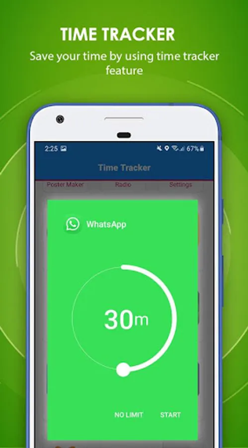 Time Tracker:- Limit your time usage by setting up the time tracker from 1 minute to one hour and launch the specific app like whats-app to track whats-app time use and get notified after the time complete to prevent from over usage of the addicted apps.