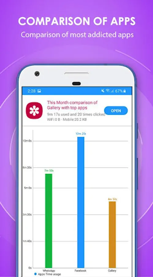 Comparison By Bar Chart:- you can compare your data and time usage with most addicted top apps like social media apps with bar chart easy to read statistical analysis through which user can easily understand and monitor time usage and data usage to cure the apps addiction.