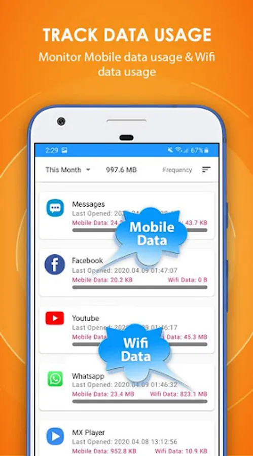 Monitor Data Usage:- Simple and Easy to use of monitor for data usage to you accurately measure your data use for both WIFI and MOBILE DATA on daily, weekly and monthly base the data use consists of send and receive traffic analysis of each app installed in your phone while it will also show when you last time opened the app.