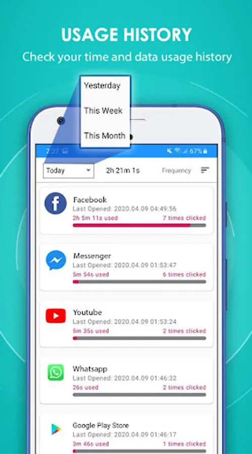 Simple and Easy tool to monitor and analyze your phone addiction over a day, week and month. This app will provide total time usage, click count and data use(Wifi and Mobile) with comparison of top apps like you can track your time usage and data usage to monitor it with top apps and social media apps like fb, wApp, insta and utube etc. Also you can set time tracker with notification manager to limit your time for specific apps and it will launch popup dialog to stop using the addicted app which protects you from time overuse, also you can further use the addicted app by ignoring the popup dialog.