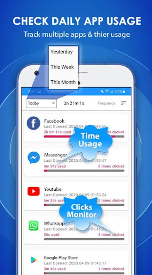 Monitor Time Usage:- Sometimes user addicted to social media apps which is effect their life style so he/she may need to limit its use to these kind of apps which will probably help them to get rid of these kind of addictions so you can achieve these kind of goal by using the app Monitor for time usage which will show you the total time use, clicks count and last time opened tag for each apps through which you can perfectly measure your time use for each app.