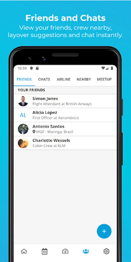 No need to exchange private phone numbers. Chat with crew on each flight, layover or start a private conversation with your friends or anybody in our aviation community