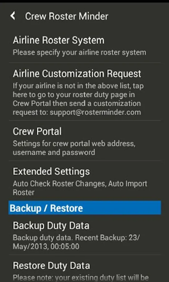 Certain airlines are supported with features of roster importing, flight crew list retrieving, auto checking noticeboard, auto checking duty changes and auto importing new roster. We are adding airlines to this support list from time to time. If you want to retrieve your roster from your airline into Roster Minder automatically, please email us to discuss options.