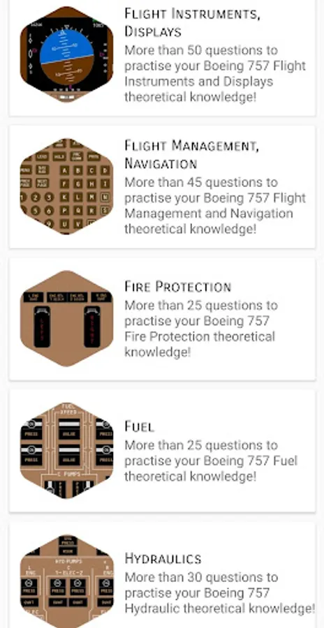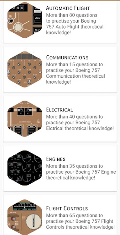 With over 650 questions in the Question Bank, we are confident it will fully prepare you to take your B757 Technical Exam or to stay current and revise the systems. Track your progress, see your exam success rate and increase your technical knowledge.