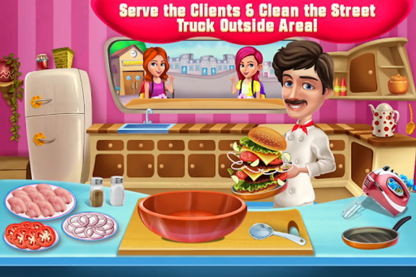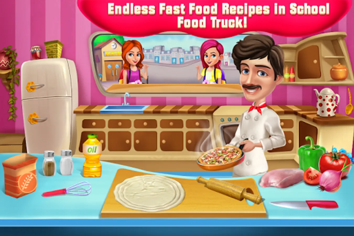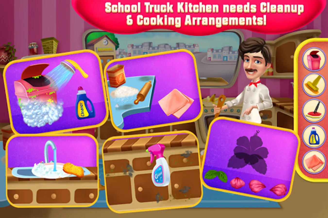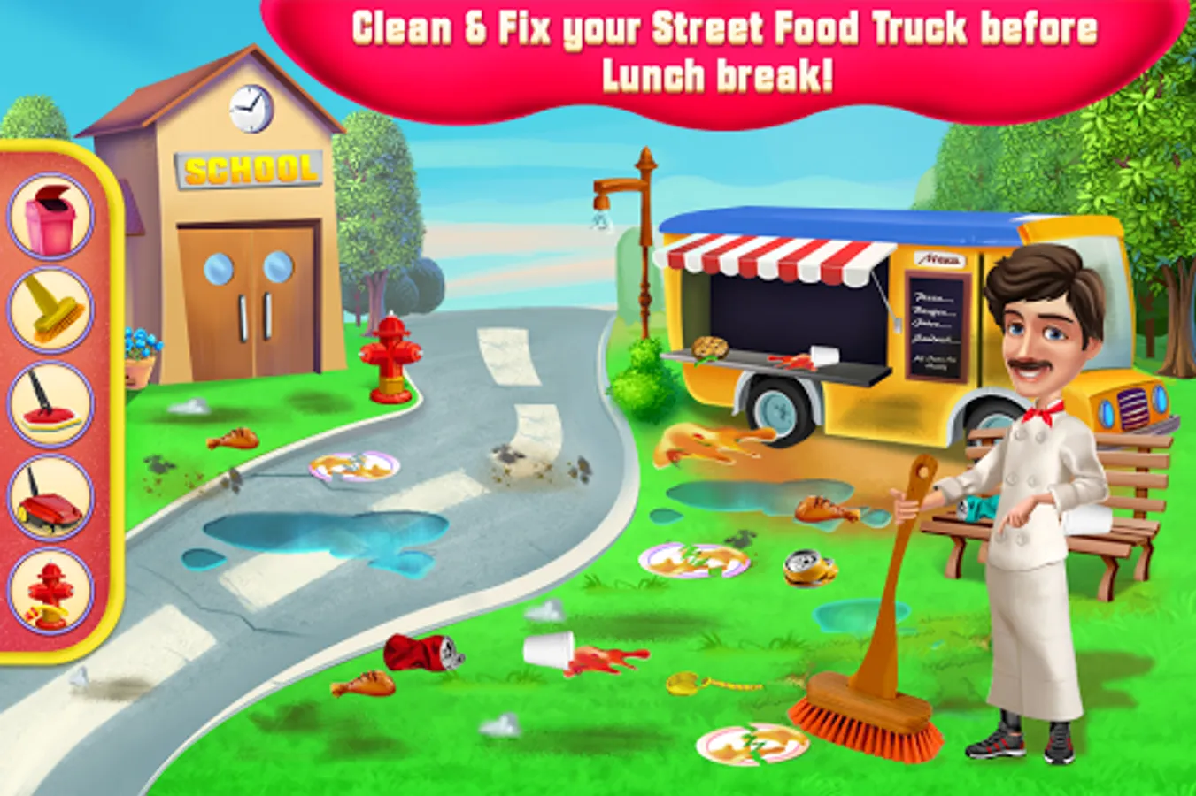 Mmm! There's an amazing smell just around the corner and it comes from your food truck. What? Yes, your food truck is serving delicious and quality plates to the children from school. Start your business as a food seller in this cooking game and try to satisfy your customers need when it comes to food. Before you can begin the cooking and serving service you must take care of the place that is providing all of these: the truck. You will have to handle the inside cleaning first because you are not having a suitable environment for making the food. Wash the dishes, clean the floors, arrange the cooking tools and clean them too. When you are done with all the tasks you can move to the outside cleaning. Because you serve near the school you should always keep that space washed out. Remove the leaves, gather the garbage and throw it in the bin, also the dirt and the water should be wiped out. Now you can go and serve your clients once you have cooked their food. Prepare delicious plates and serve the truck's specialties. Make sure your clients are happy about the service and try to honor their order. You will have a varied menu with pizza, burgers, sandwiches and yummy juices. Once the clients are all pleased you can continue the game with the decorating part. Design an appealing look for the food truck and use different tricks to make it more welcoming.