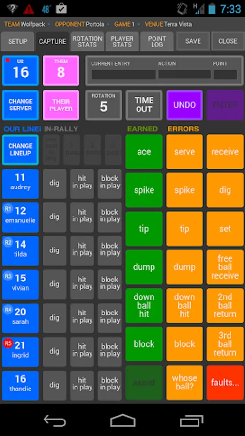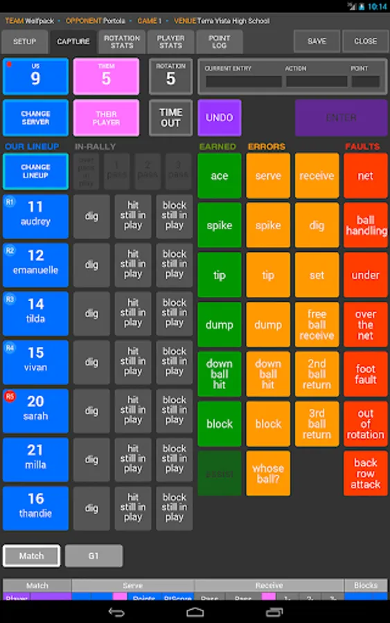 - In-Rally stats for pass rating, serve rating, hitting, blocking and dig attempts