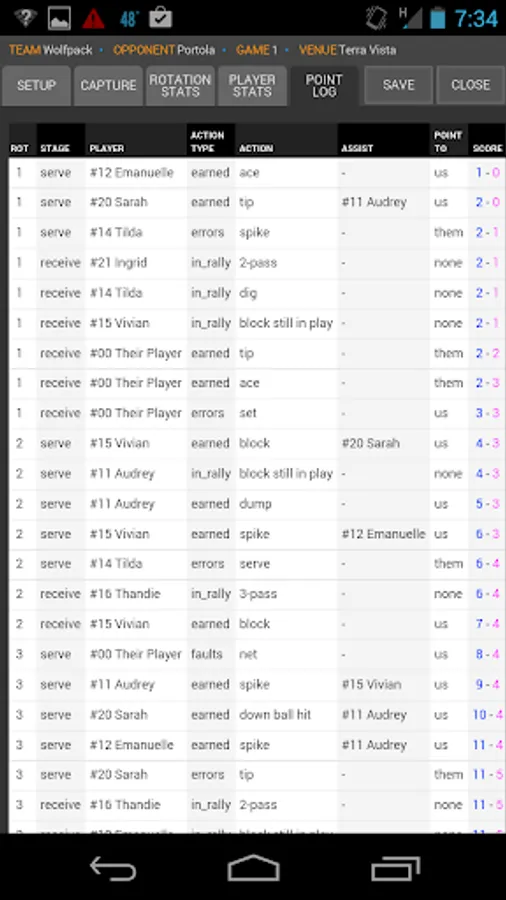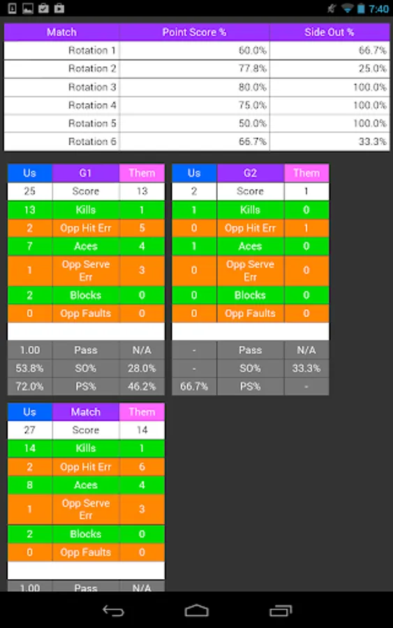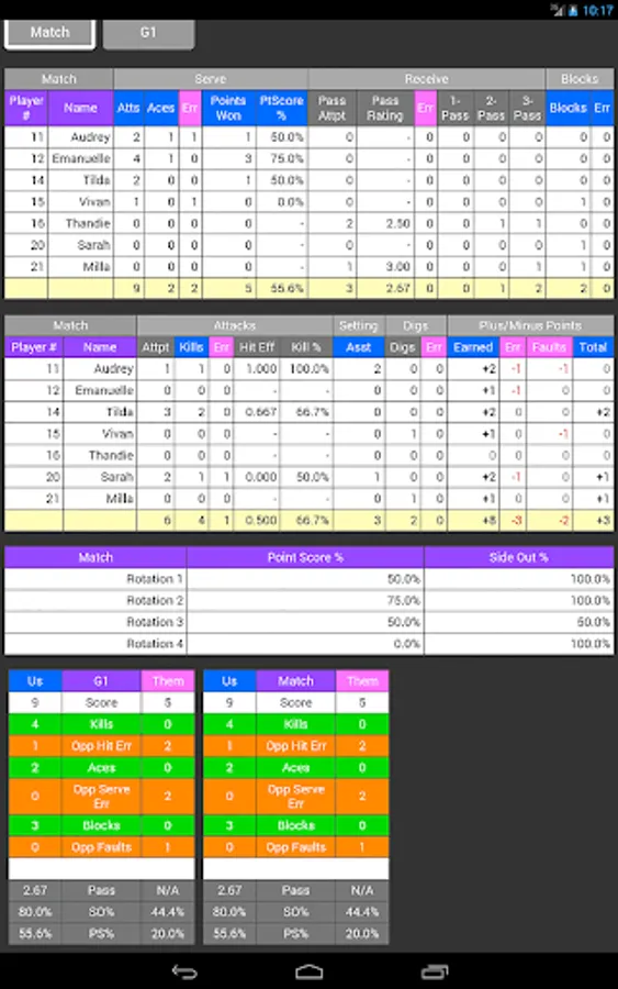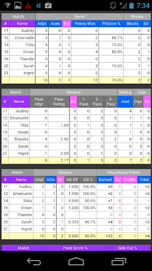 - Stats you can act on, including side out %, point scoring %, and +/- differentials