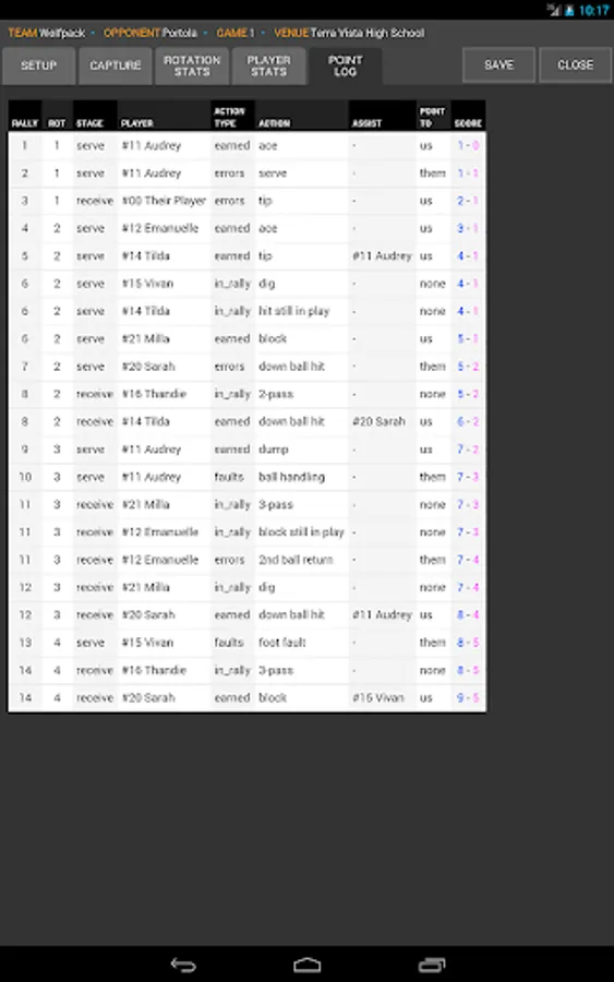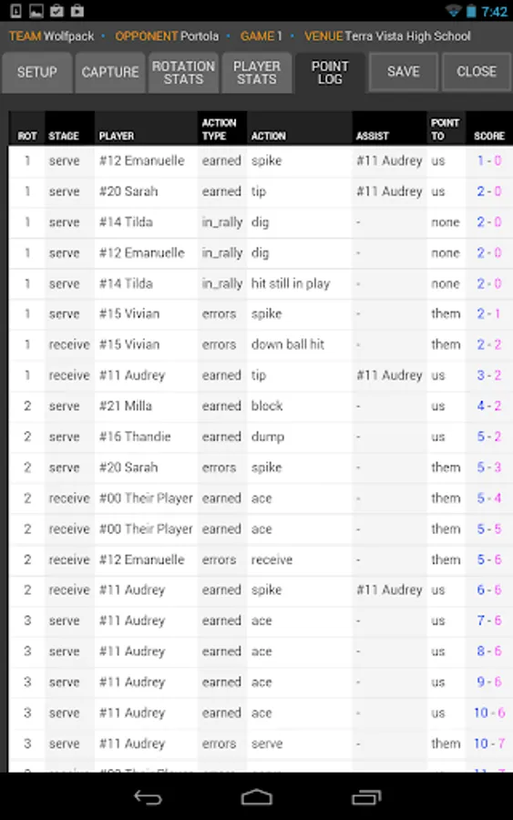 SoloStats focuses on capturing actions that result in points, either for or against. You can also use SoloStats to capture in-rally stats for pass rating, and attack and dig attempts. An as your tracking needs increase to more in-rally touches, you can upgrade to SoloStats LIVE for free.