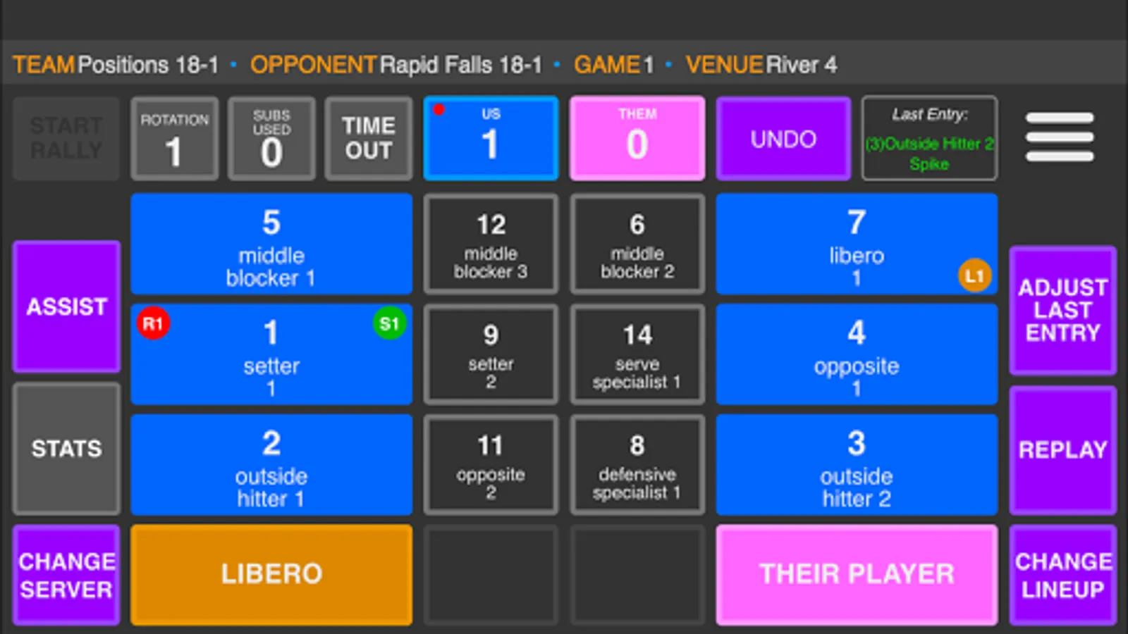 - Get all the critical stats in your hand - score, kills, aces, receive, timeouts, sub count, next server