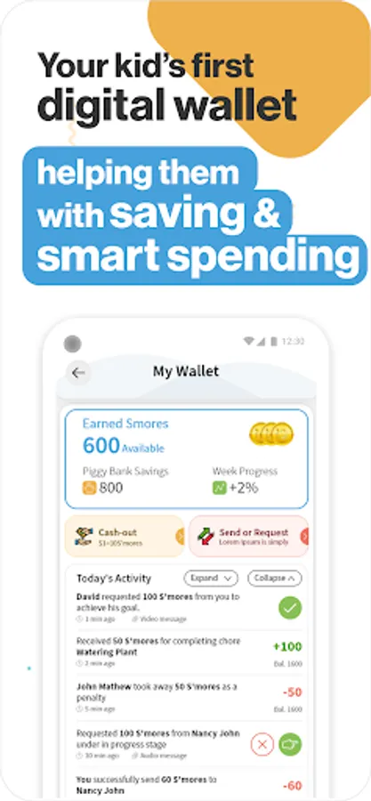 --> Allowance Management: S'moresUp provides a comprehensive chore-reward management system (kids earn S'mores/points for every chore/action completed) that allows children to learn important life lessons regarding money management and smart spending/saving. The allowance tool provides an easy way to incentivize kids to do the right things, applying a penalty when they do not.
