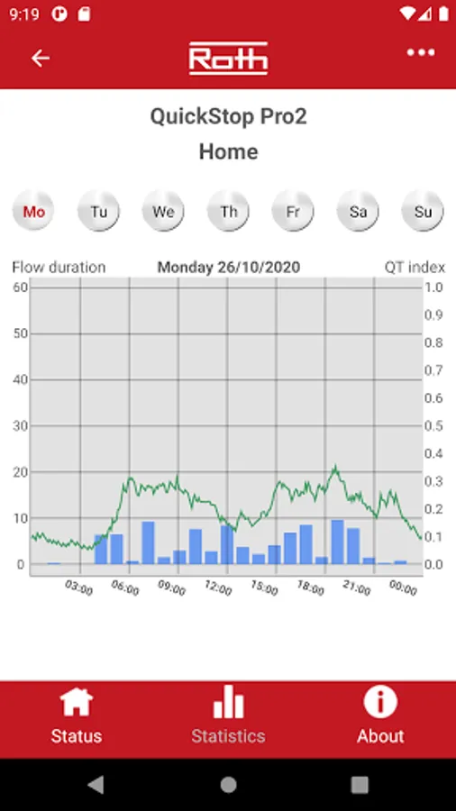 The Roth QuickStop Pro app allows monitor your entire domestic water system for leaks. Manage status, alarms and receive statistics from your QuickStop water leak breaker in your mobile. Keep an eye on your house when you are away and your leisure home when at home.