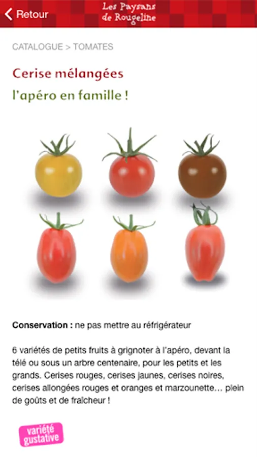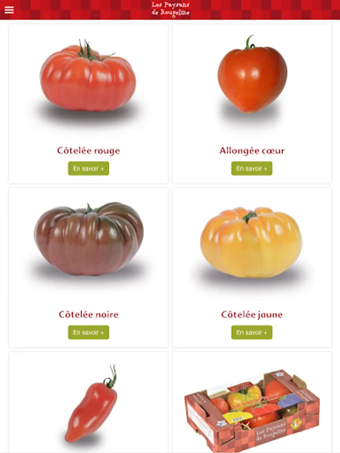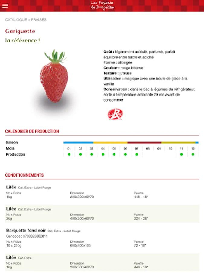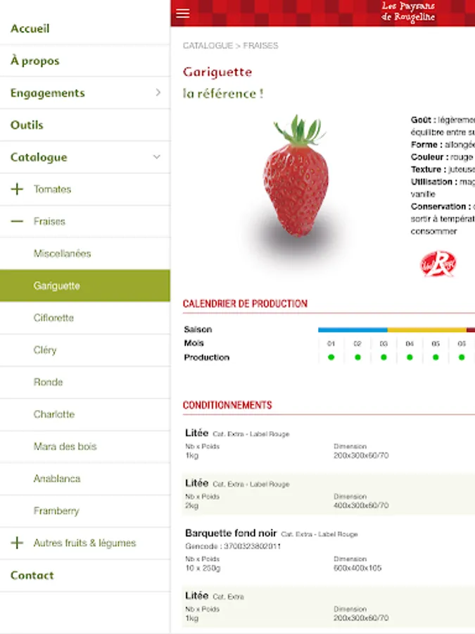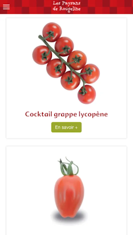 The app Peasants Rougeline is a tool for retail professionals. It offers the ability to view a detailed catalog of fruits and vegetables that we grow in the South of France (tomatoes, strawberries, cucumbers, kiwis, asparagus, peppers, eggplant, salads ...), information on the brand's commitments ( local production, taste, agroecology ...), on the commercial tools available to inform and entice gourmets who are looking to taste fruits and vegetables, healthy and grown in respect for the environment.