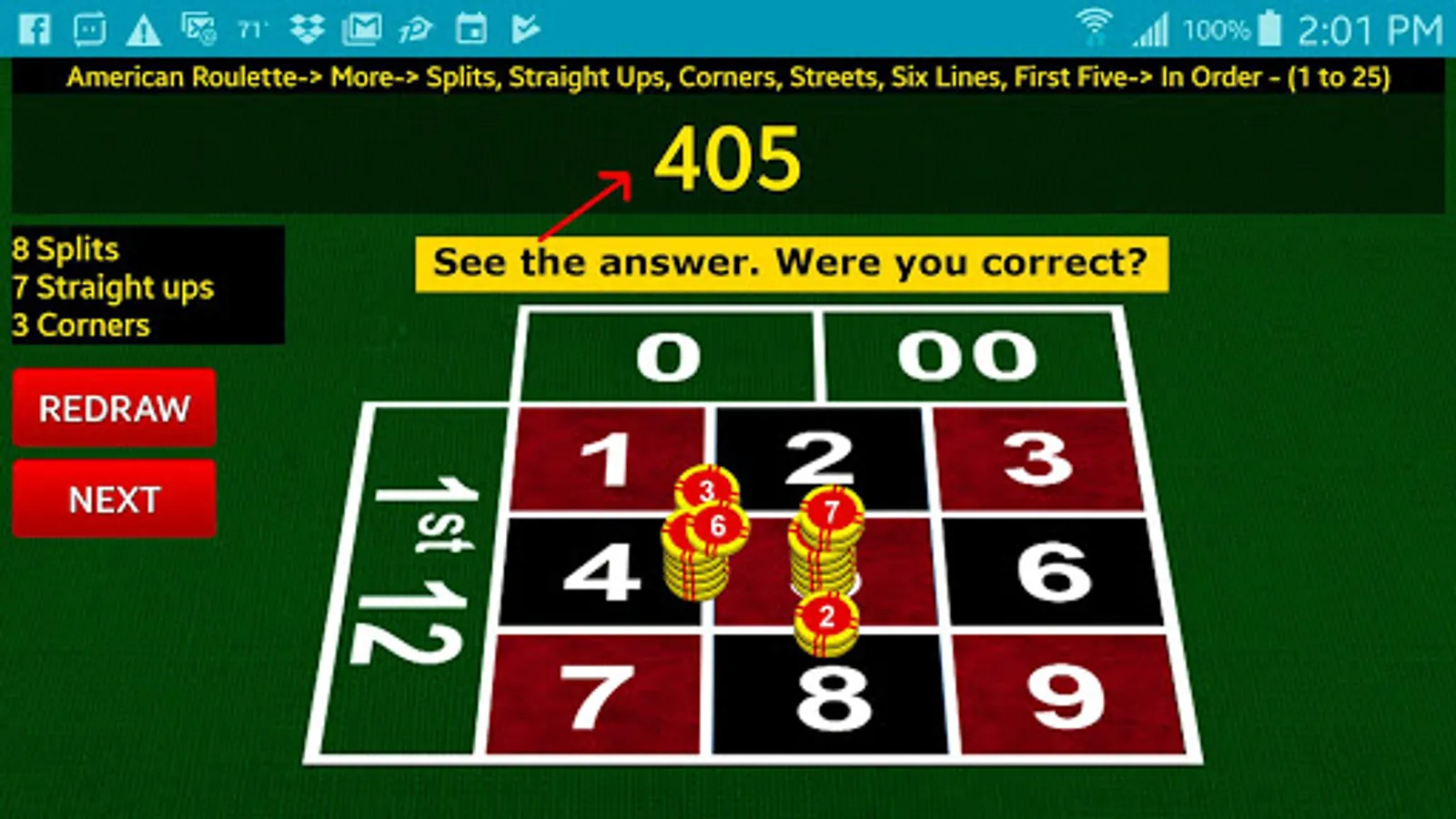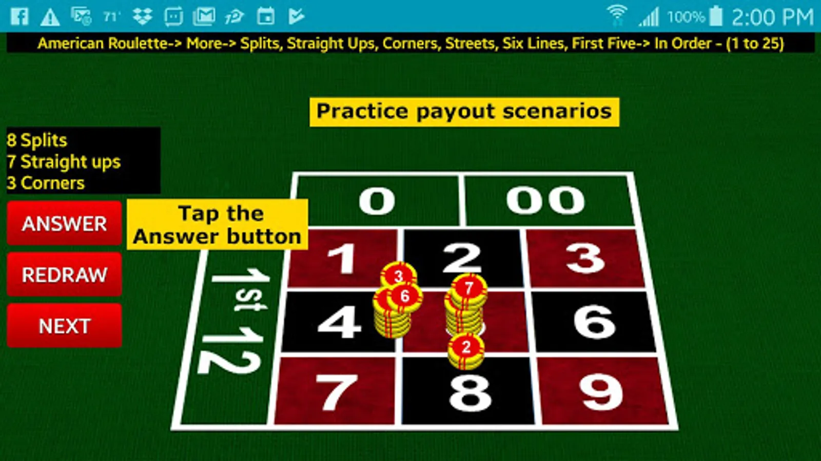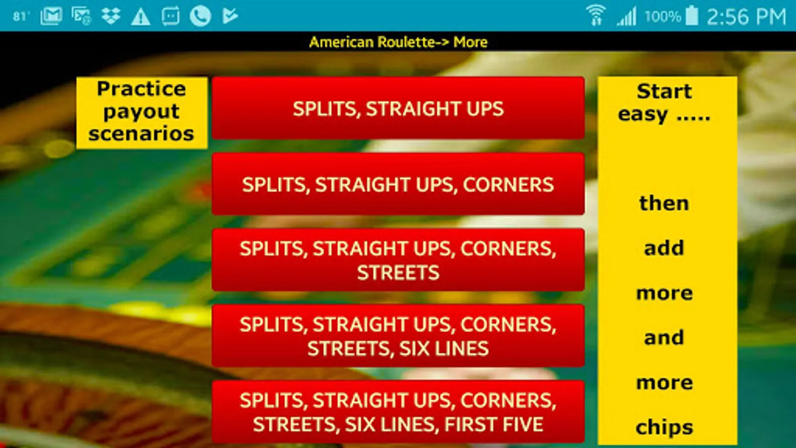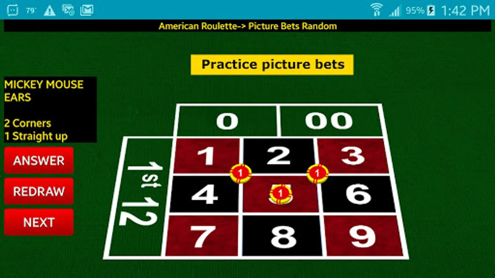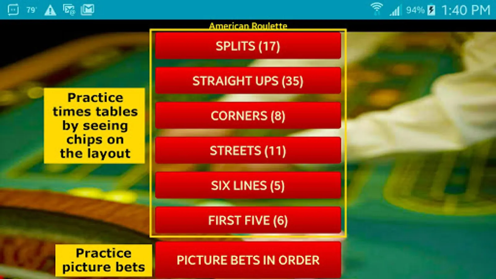 Learn, and practice, roulette times tables, by seeing 3D chips on a realistic layout.