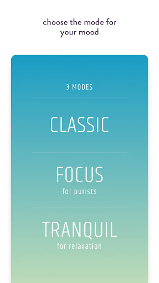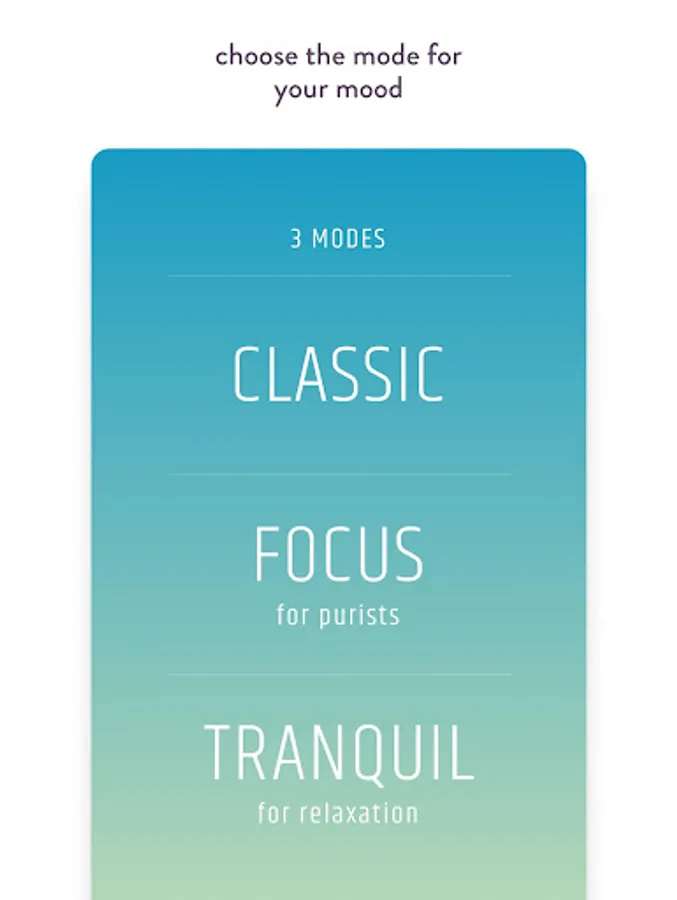 • 3 unique gameplay “mood modes”. Classic, Tranquil, and Focus.