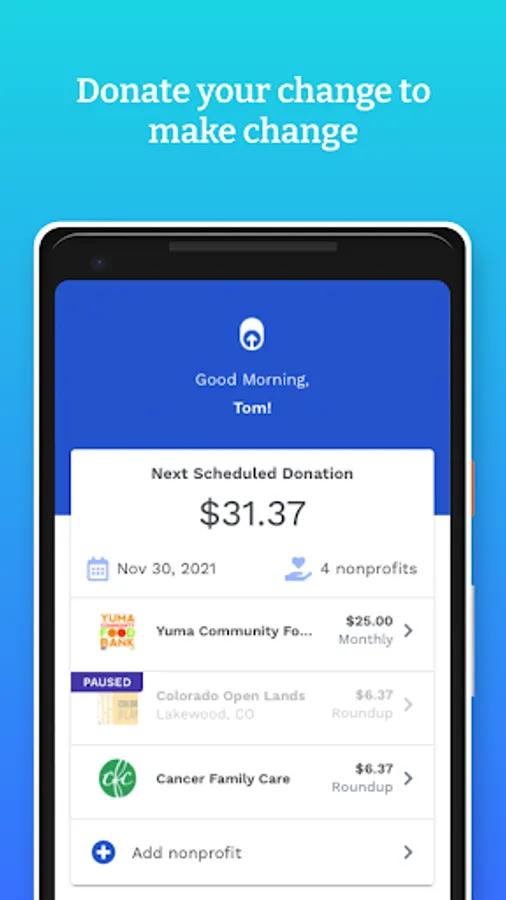 Make an impact without breaking the bank by donating your change to a nonprofit. We've partnered with hundreds of nonprofits to make giving easy.