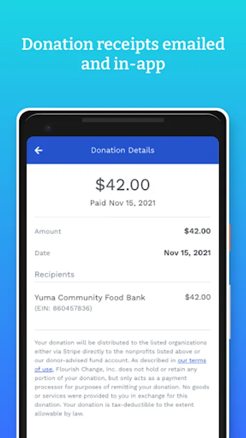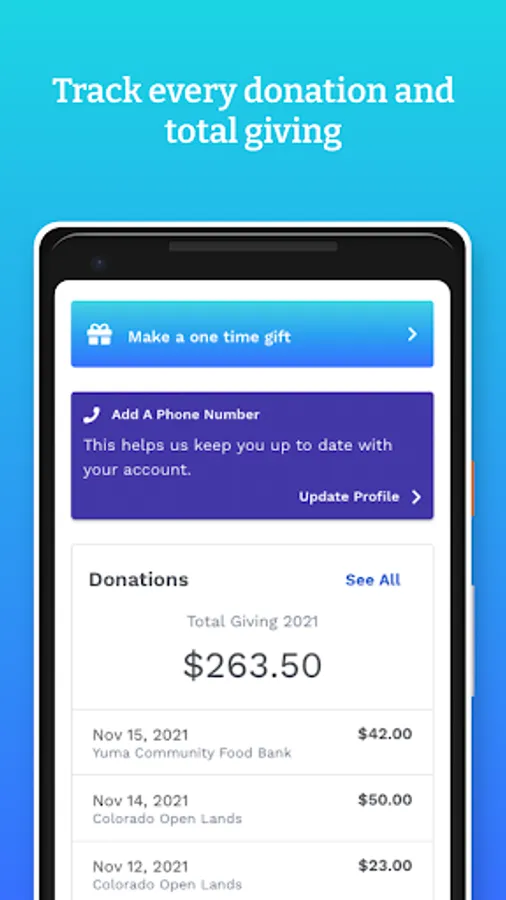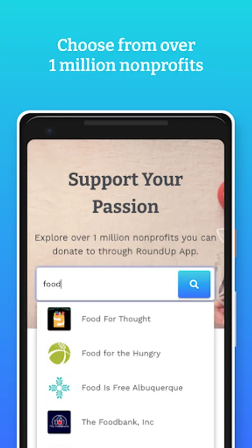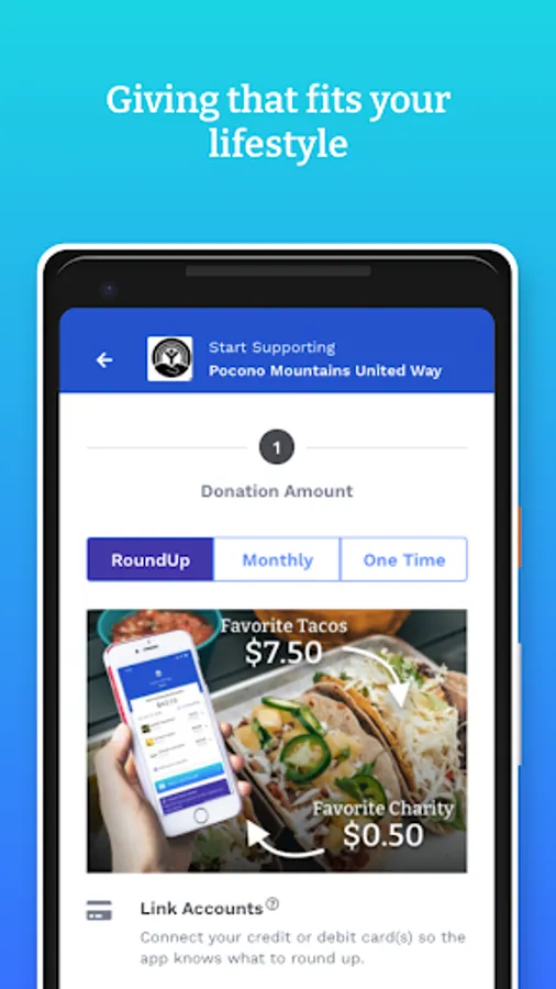 - Create an account, choose the organization you want to support, and connect to your credit or debit card account
